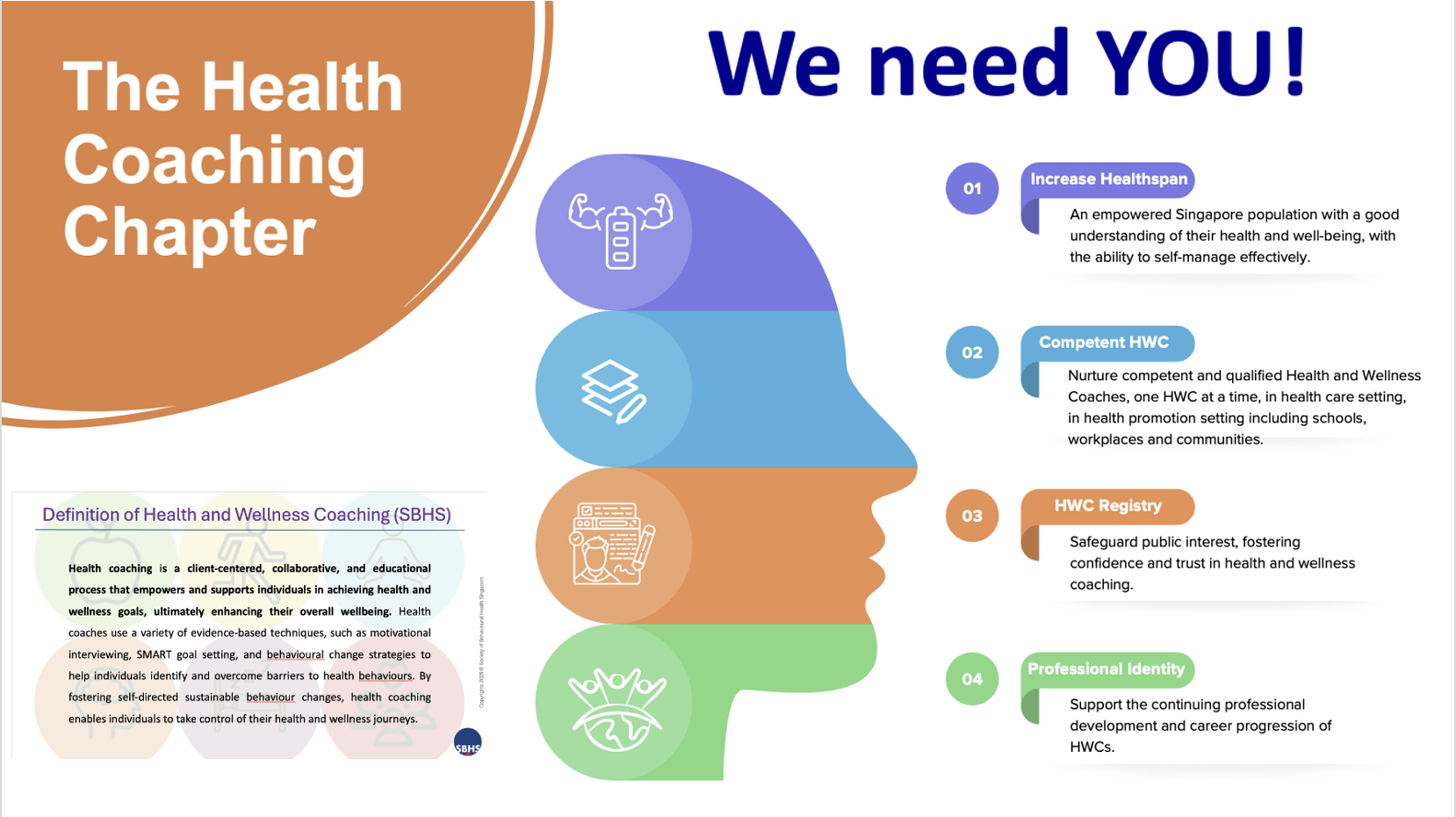 We are a group of like-minded and dedicated individuals within SBHS who share a passionate commitment to advancing the practice of health coaching in Singapore through the creation and setting of self-regulatory health coaching framework and standard. We recognised that building up a pool of competent Health and Wellness Coaches who will be able to tailor a more holistic and personalised strategies to address each individual's unique lifestyle factors, provide guidance on behaviour change, and help individuals maintain accountability in developing sustainable lifestyle changes and promoting overall health and wellness is of paramount importance and will revolutionise the way health and wellness are approached which is in line with Healthier SG.